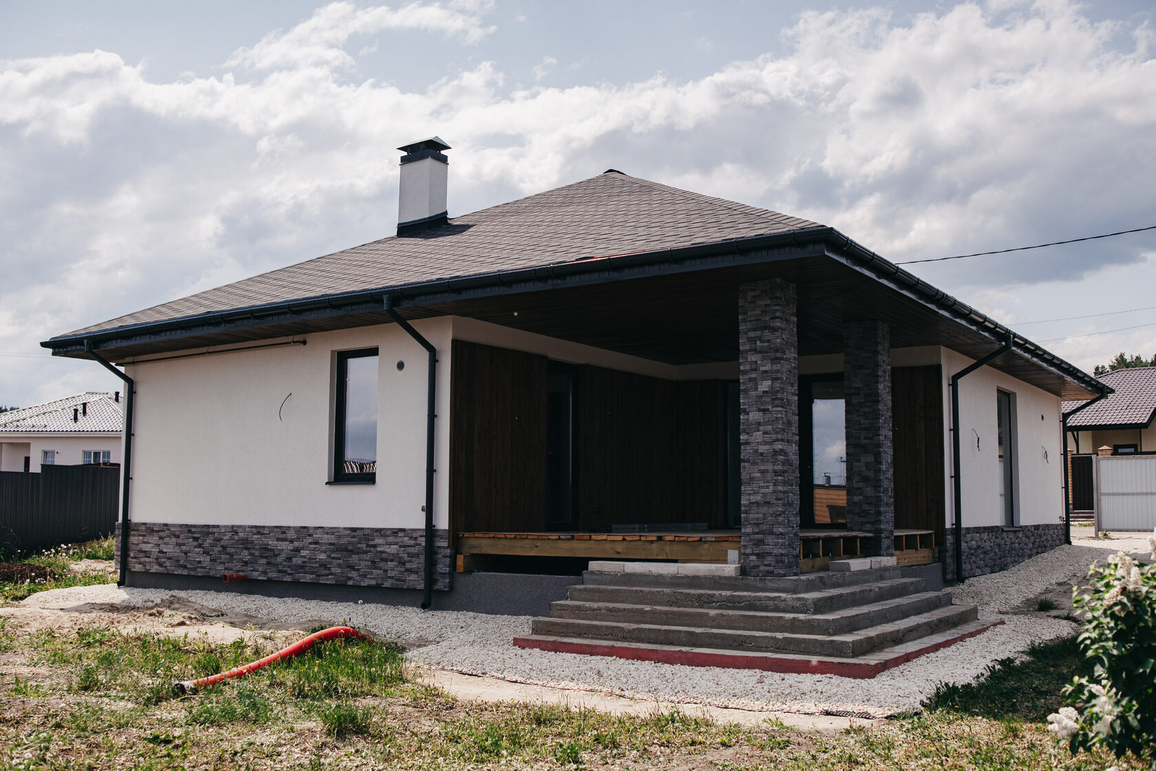 Одноэтажный дом-баня по индивидуальному проекту общей площадью 98,8 м², расположенный в живописном коттеджном поселке ШАТО-2.